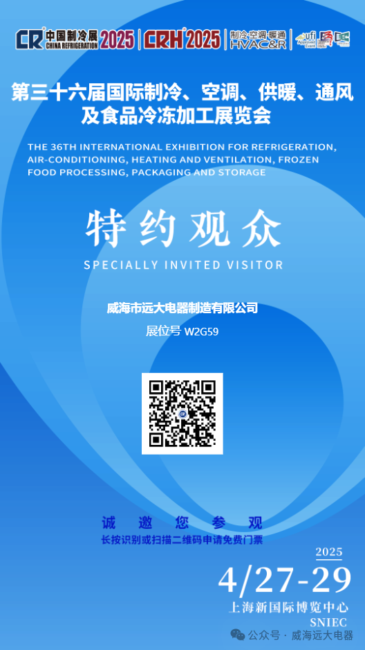 您好!非常感謝您長期以來對威海遠大電器的大力支持,第三十六屆中國制冷展即將亮相上海,屆時我們展會現場將會進行我司產品陳列展示,在此,我們誠摯的邀請您蒞臨我司展位參觀指導,我們將會為您提供貼心、專業(yè)的產品與技術服務。
